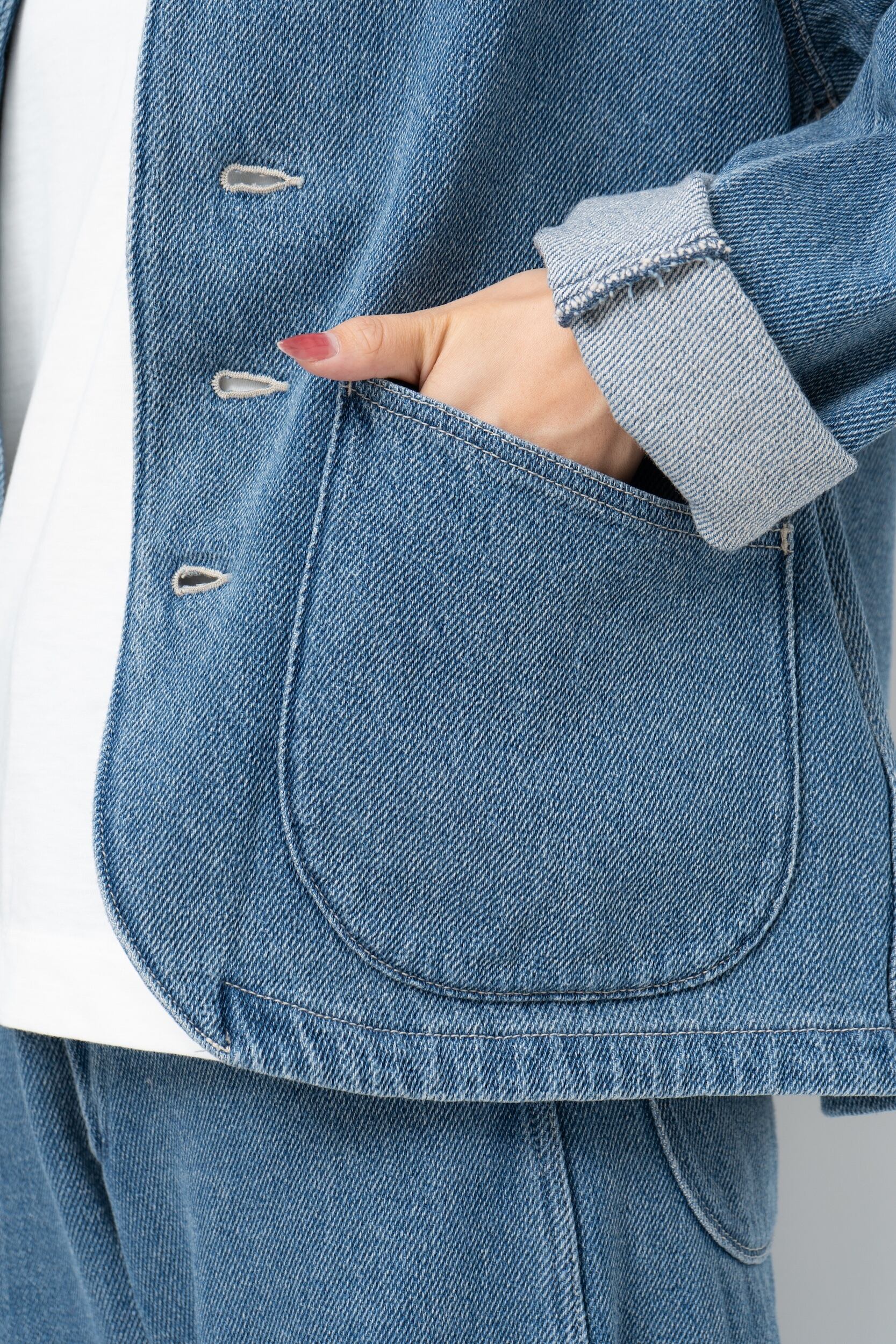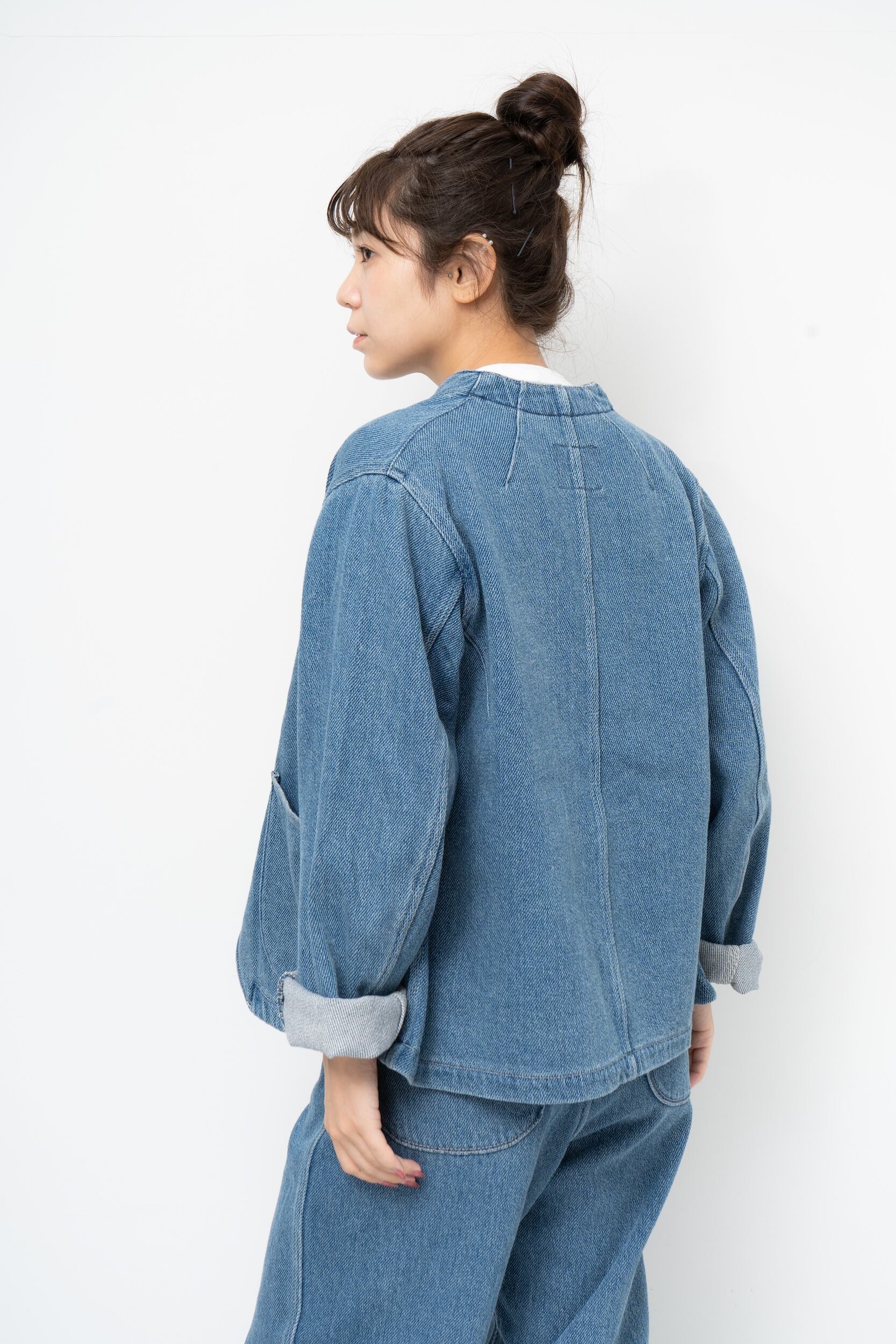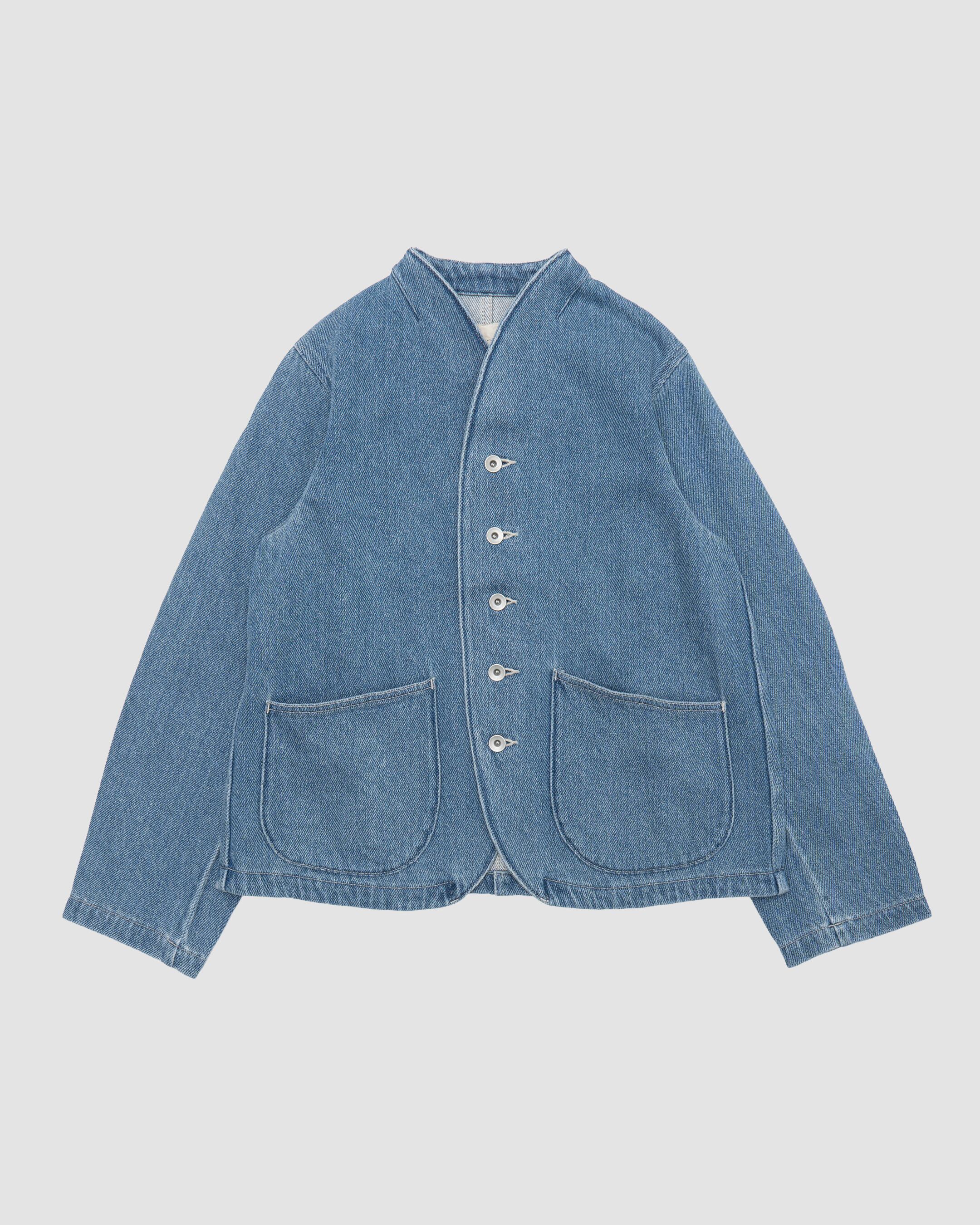水溶性の糸を綿糸と撚り合わせた特殊な糸をヨコ糸に使用した11.4OZのデニム生地を使用した、丸みのあるフロントポケットが特徴のスタンドカラーのジャケット。