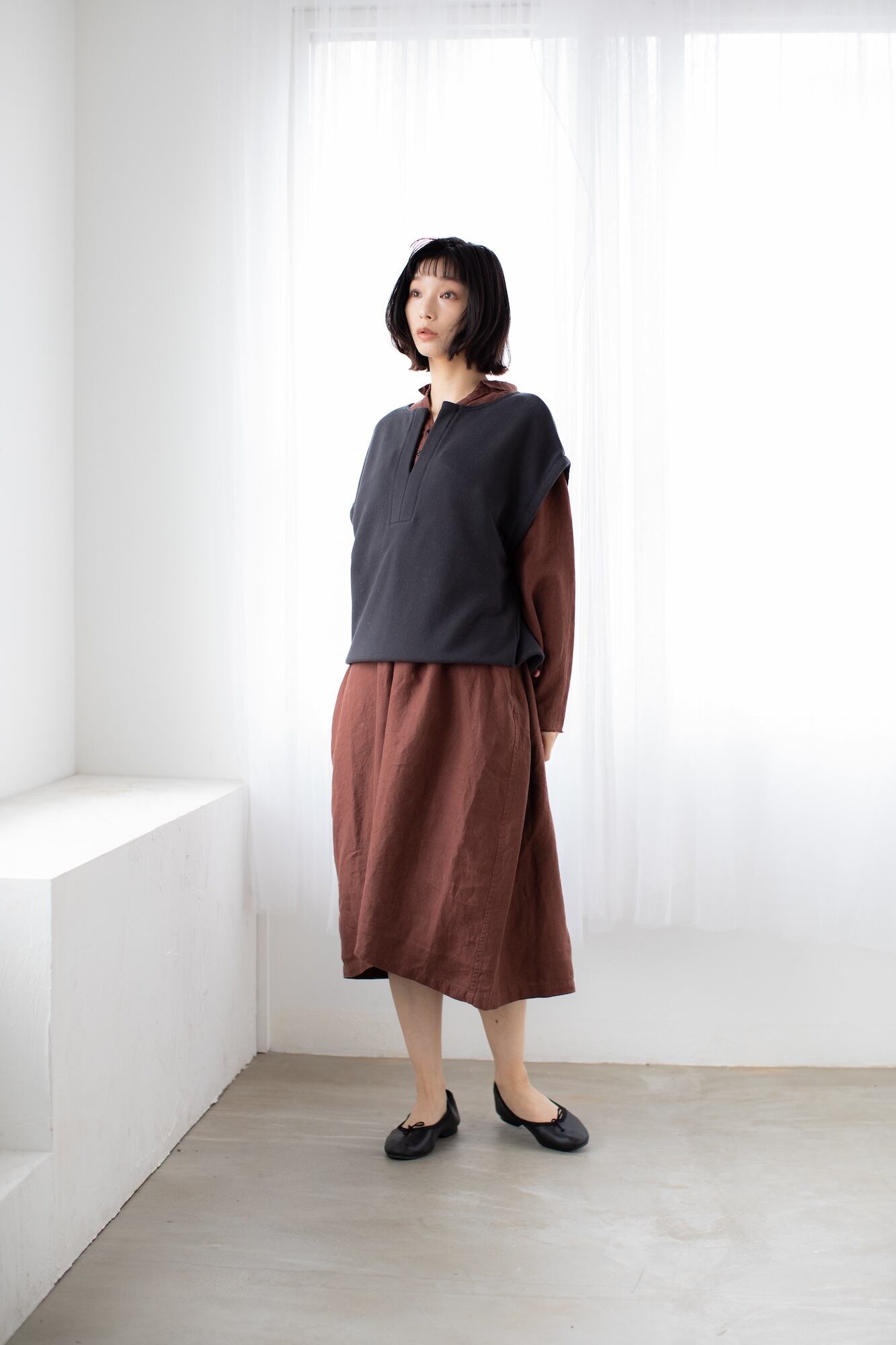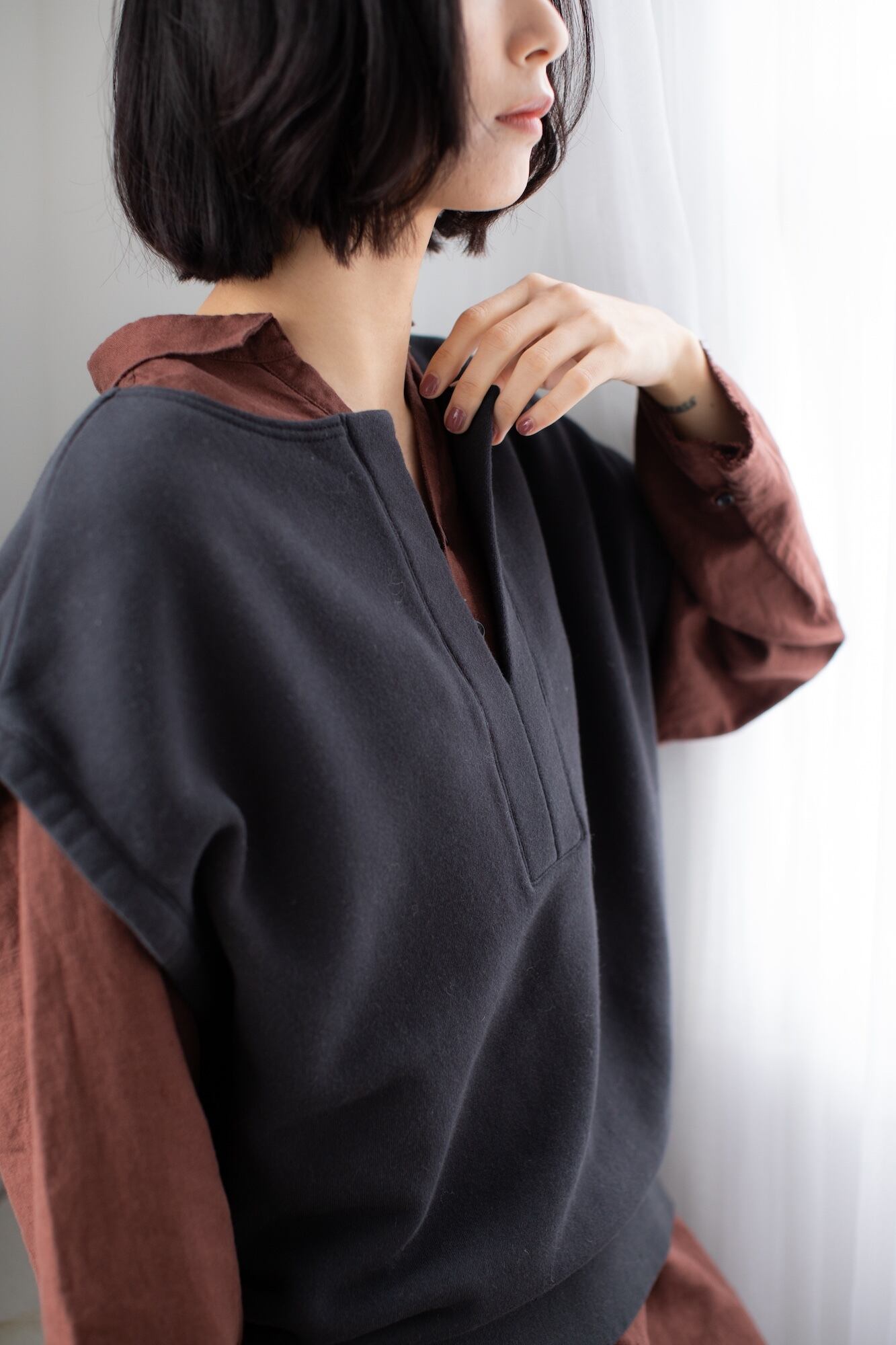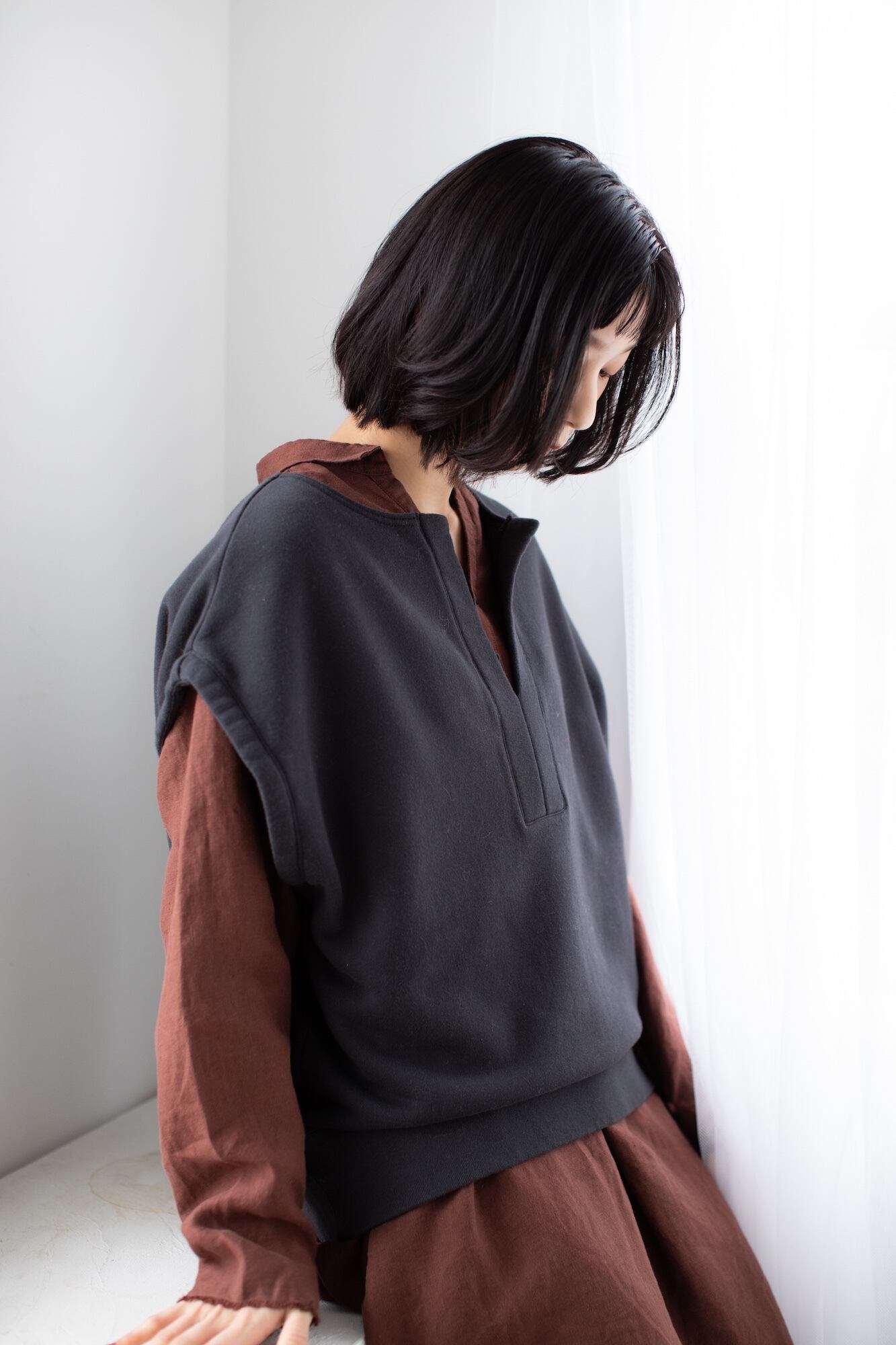 スキッパーの衿ぐりがアクセントの裏起毛スエットベスト。
