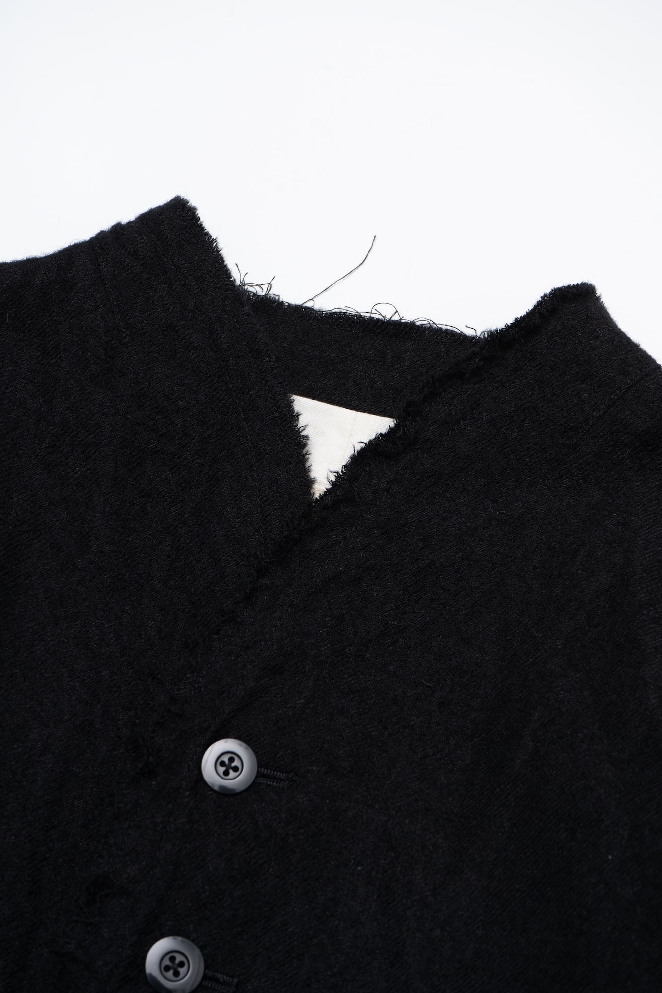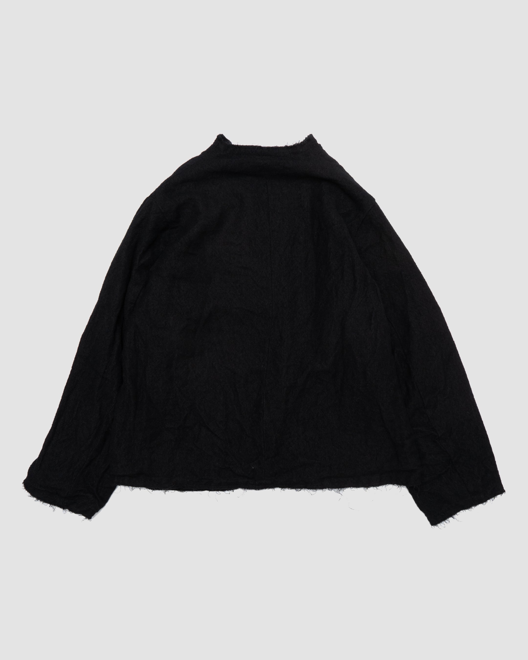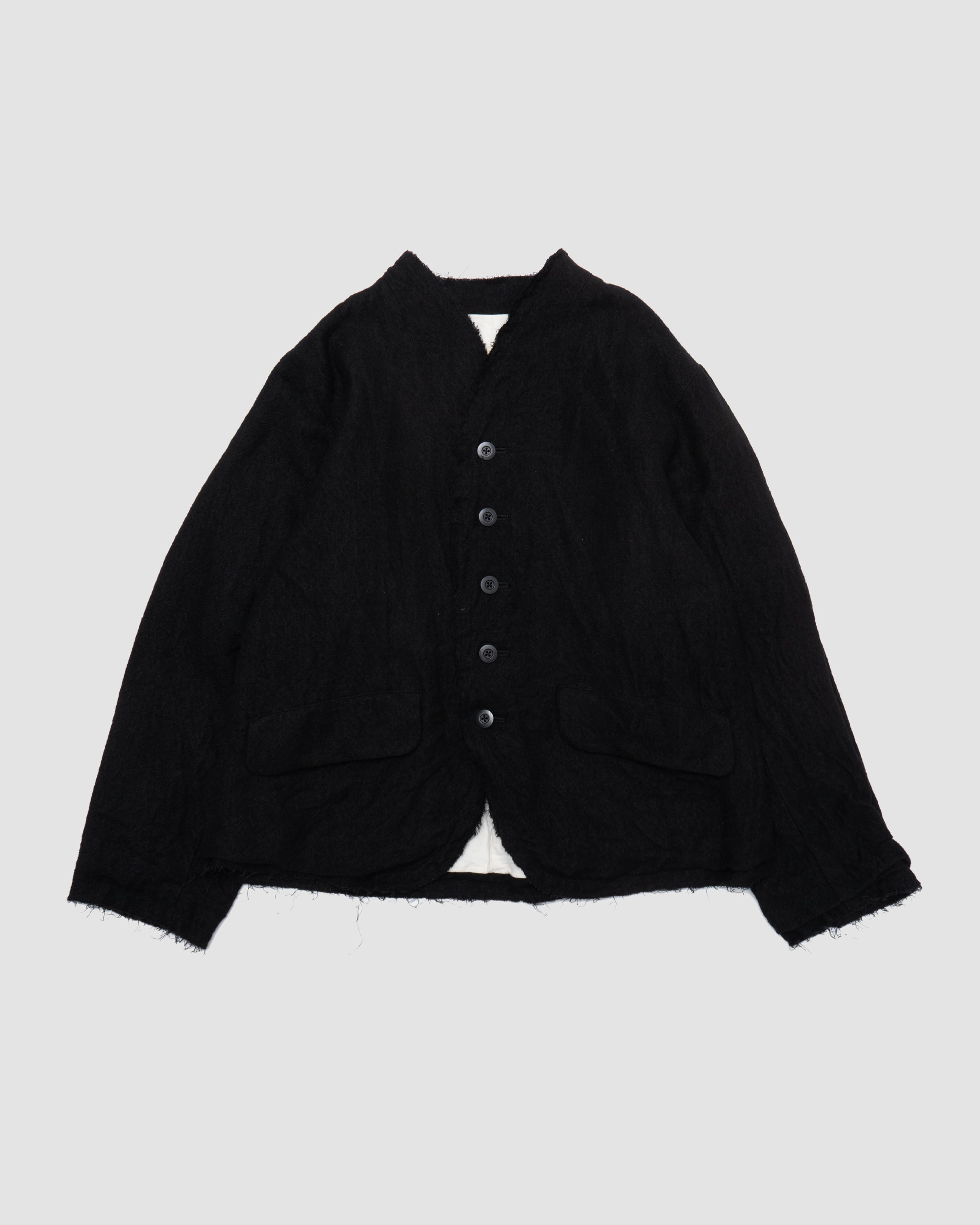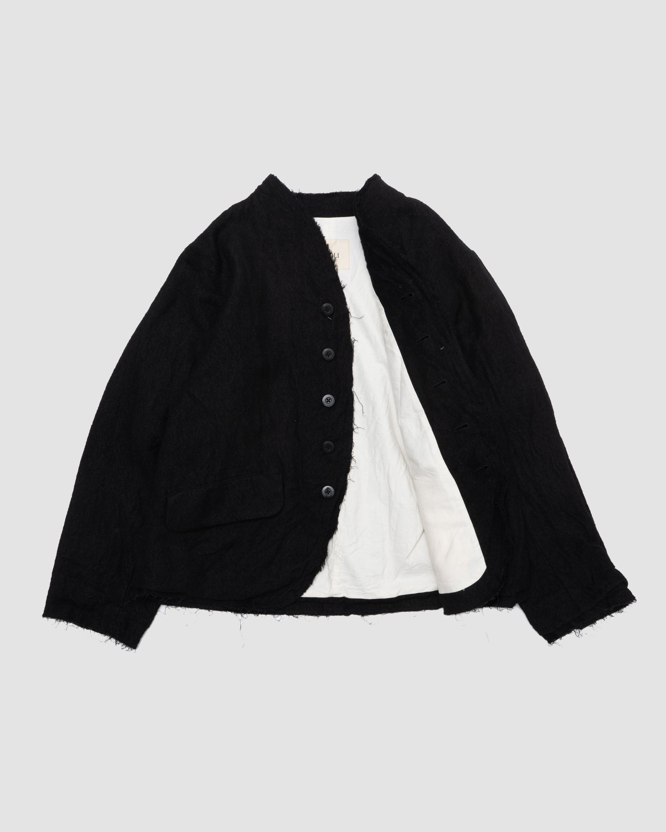 カットオフで仕上げたスタンドカラージャケットで、裏地に綿生地を使用しており洗いで表と裏の収縮差を出しています。