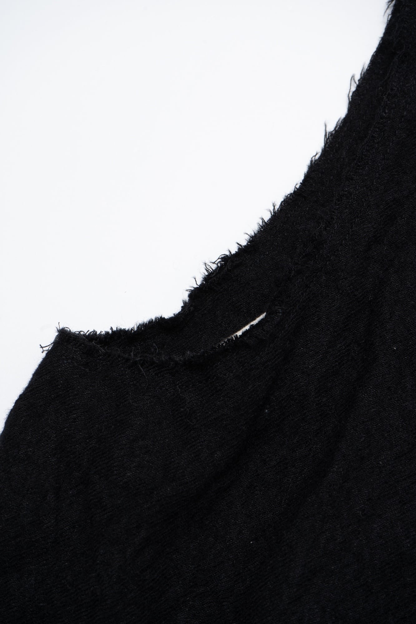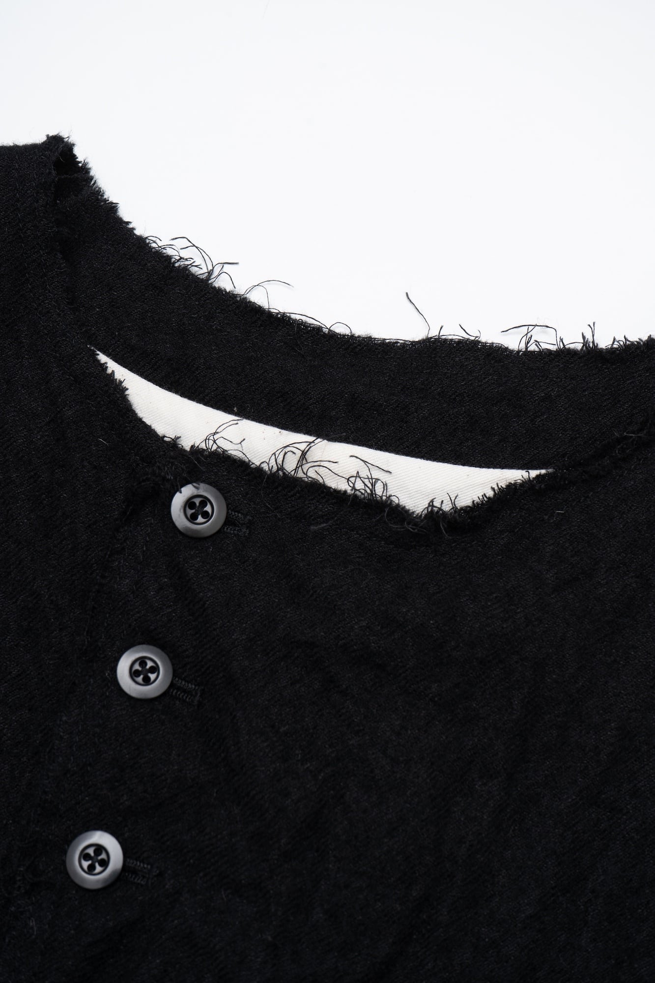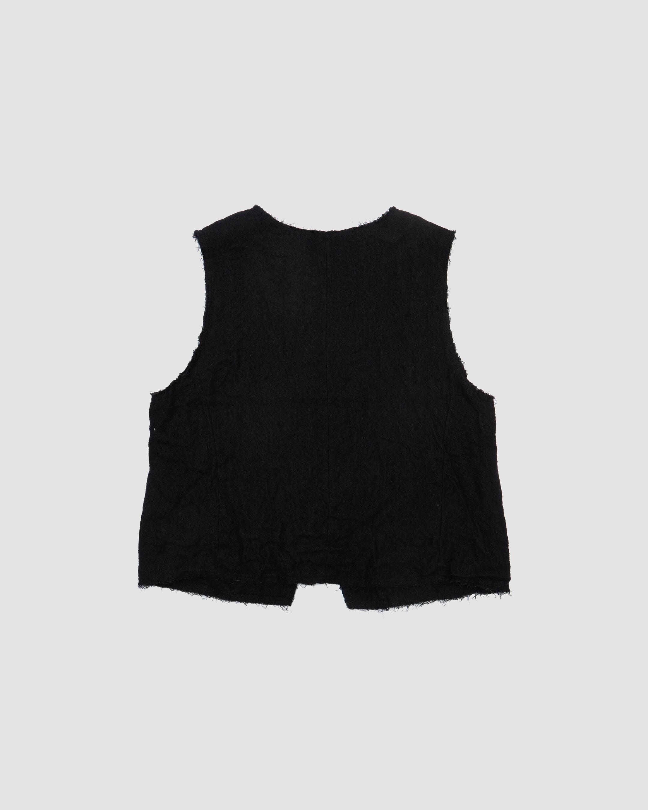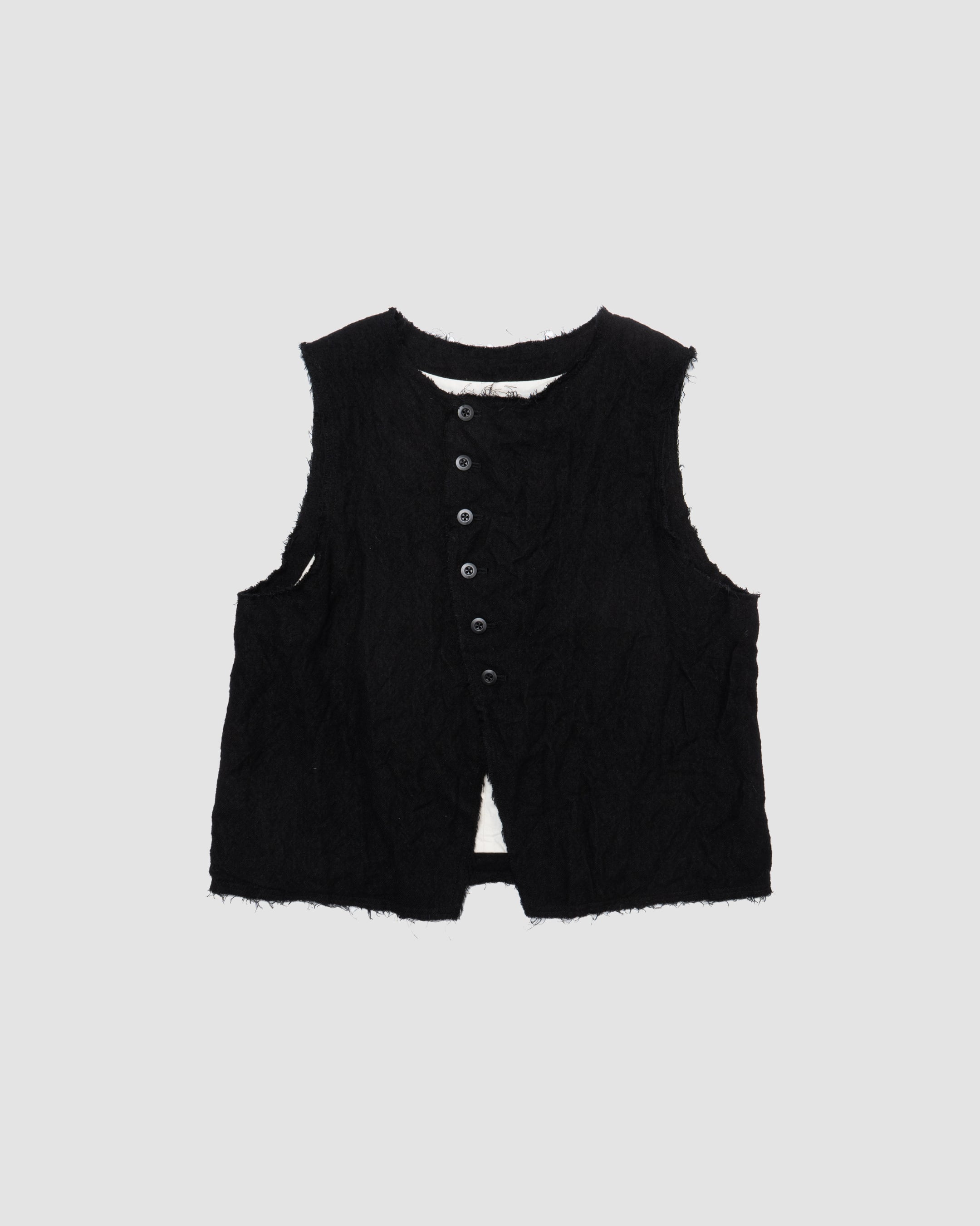 カットオフで仕上げたベストで、裏地に綿生地を使用しており洗いで表と裏の収縮差を出しています。