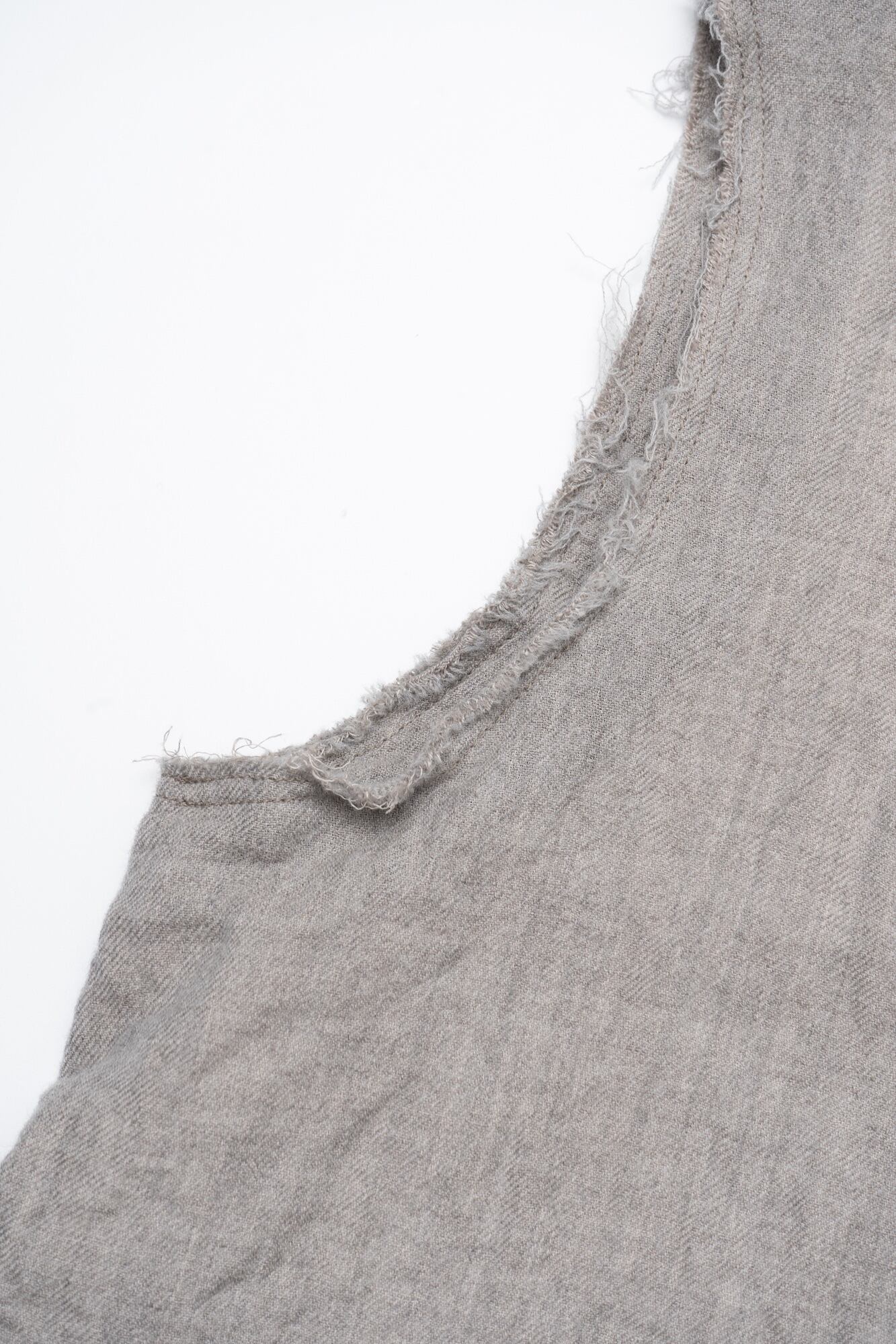カットオフで仕上げたベストで、裏地に綿生地を使用しており洗いで表と裏の収縮差を出しています。