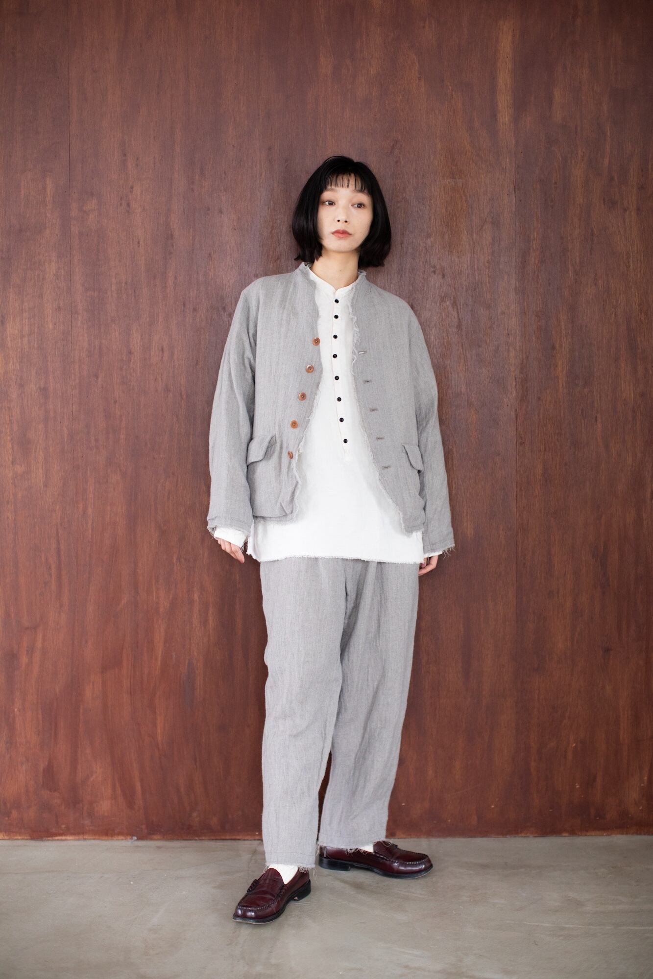 タテ糸にウール、ヨコ糸にリネンを使用した交織織物。仕上げにハードミルド加工(縮絨して毛羽立たせ、剪毛して圧絨することで生地表面に短い毛羽を持たせる)を施しカジュアルな表情にした生地。