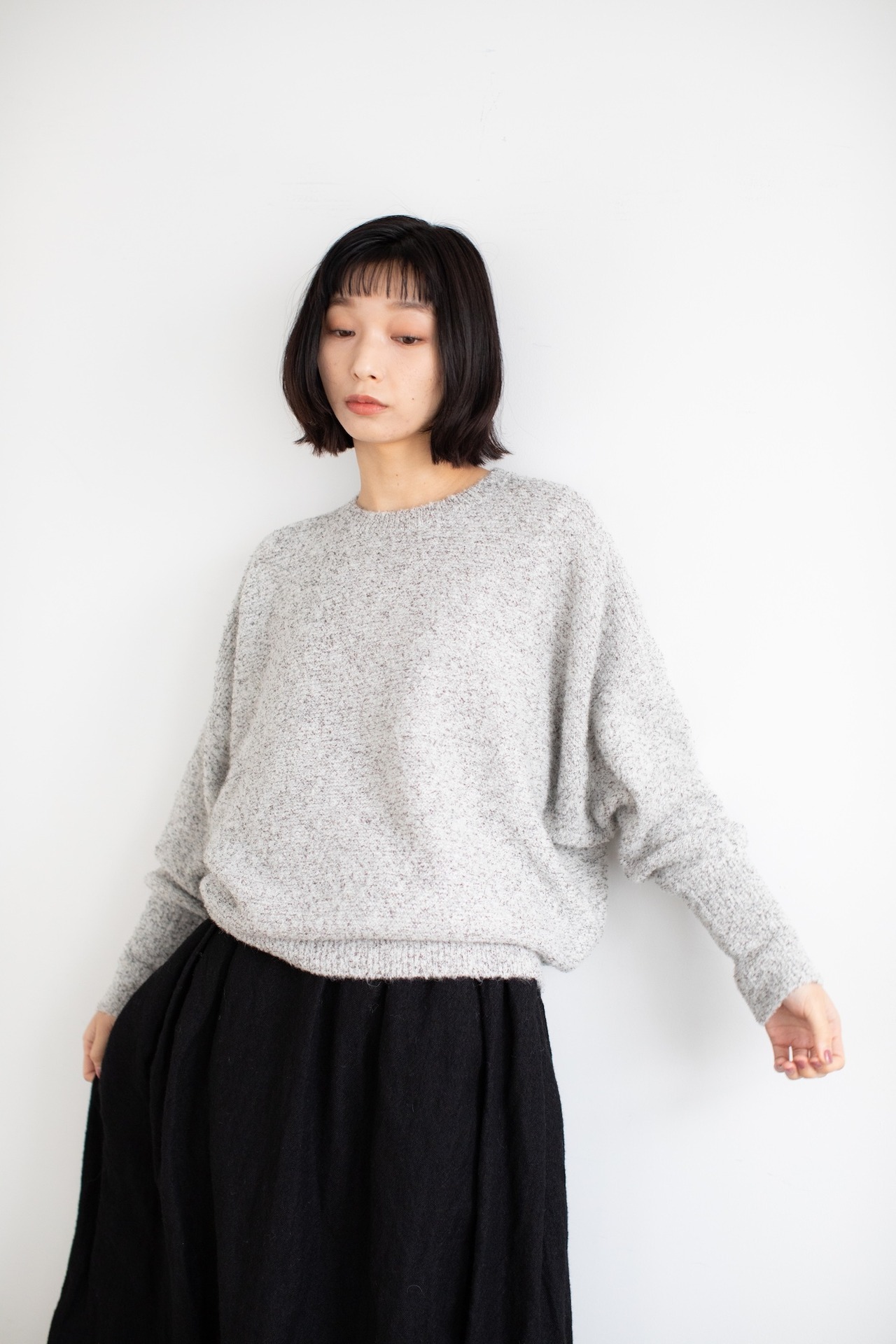 ゆったりとしていながら、袖口や裾はリブが利いているドルマンスリーブニット。