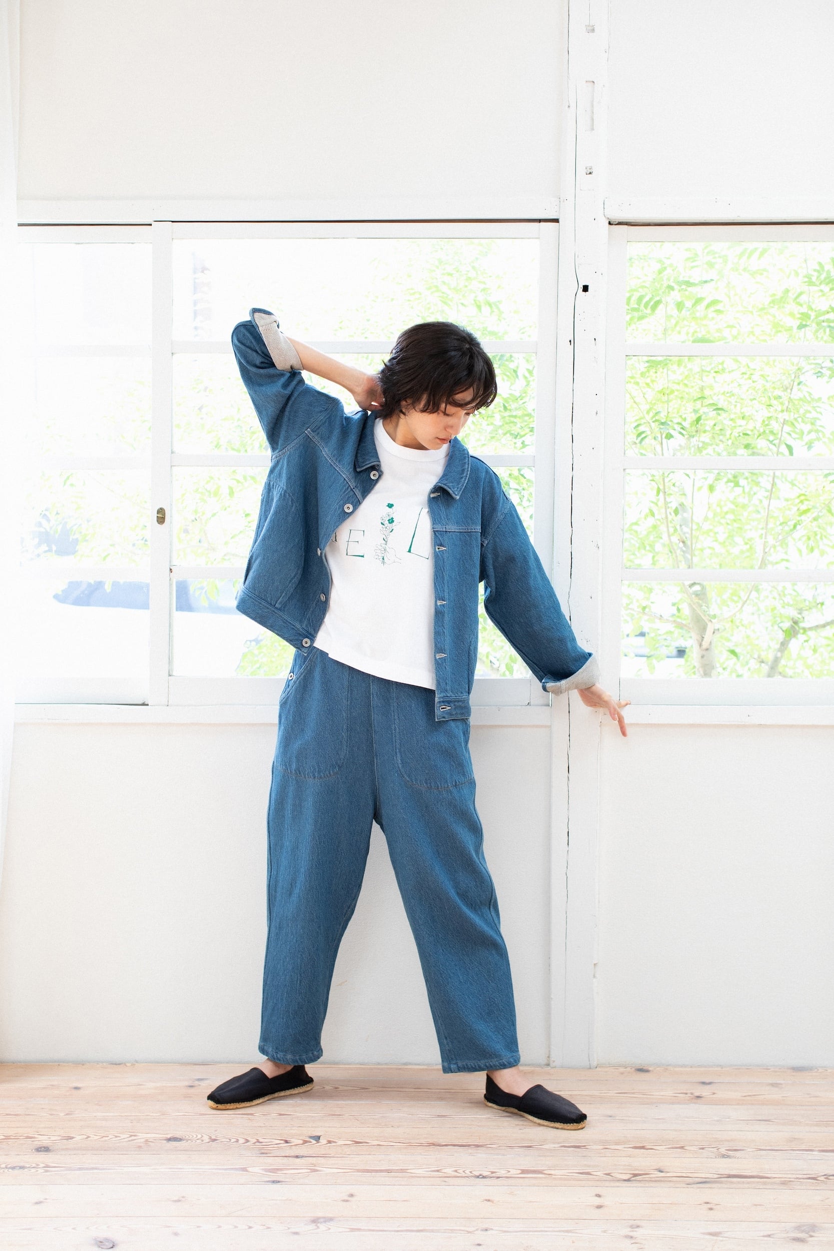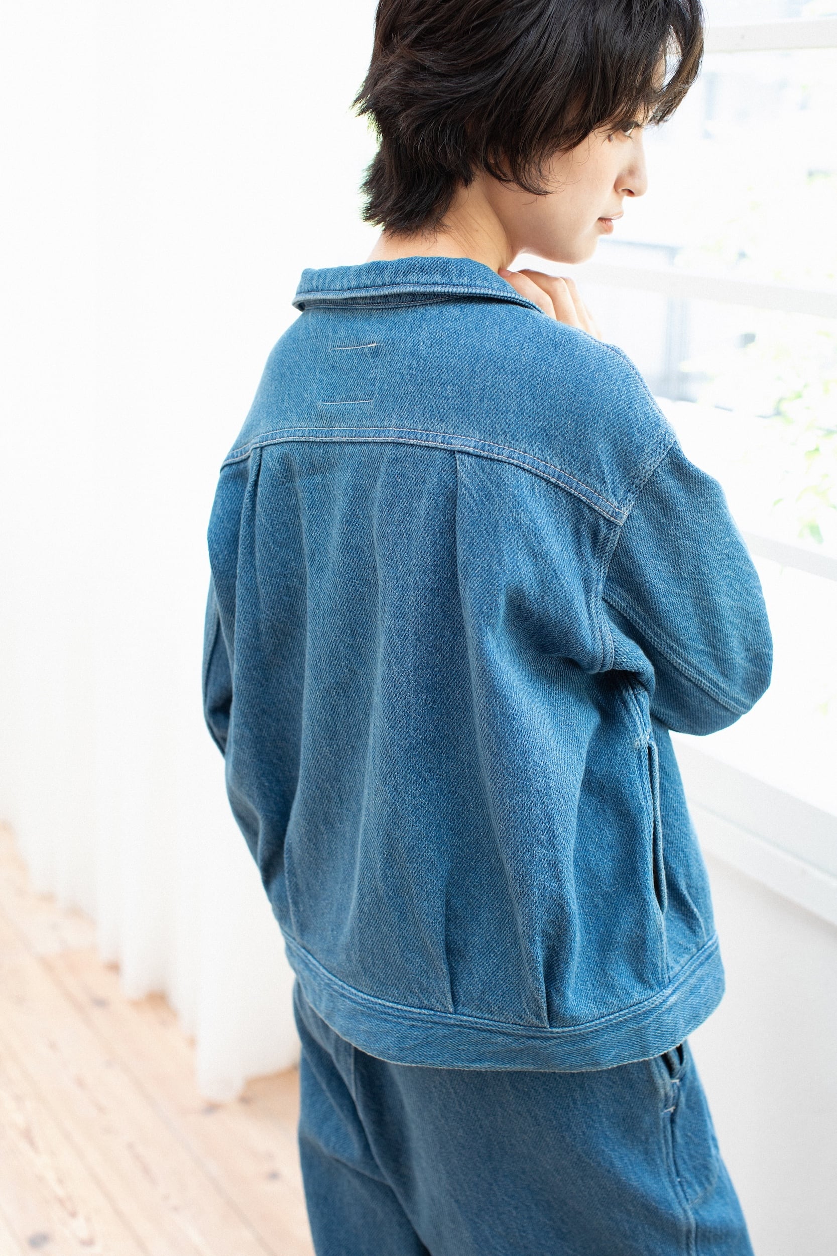 デザインはショート丈の軽いデニムジャケットで、加工感のあるインディゴとホワイトデニムの2色展開。