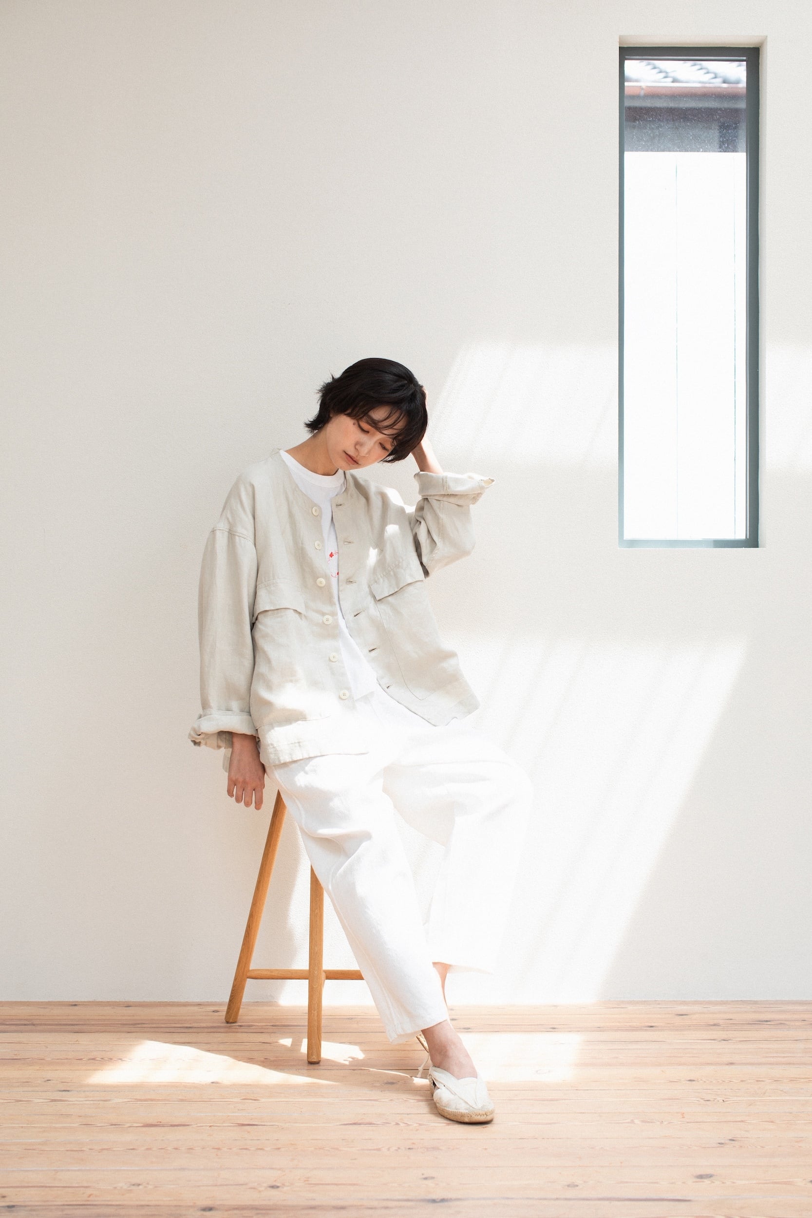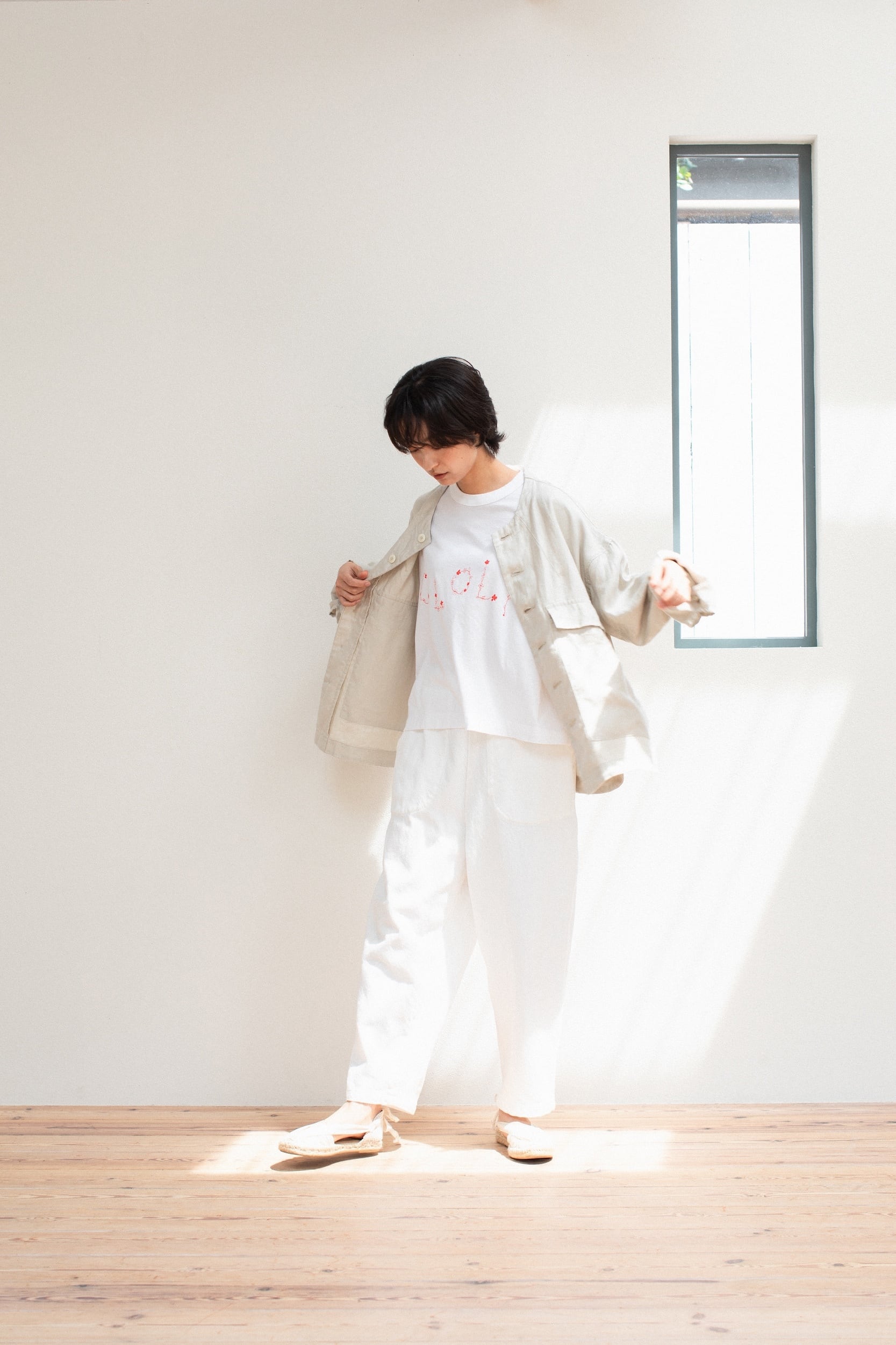両サイドにボタン明きのあるテーパードクロップド丈のマリンパンツのデザインで、加工感のあるインディゴとホワイトデニムの2色で展開。