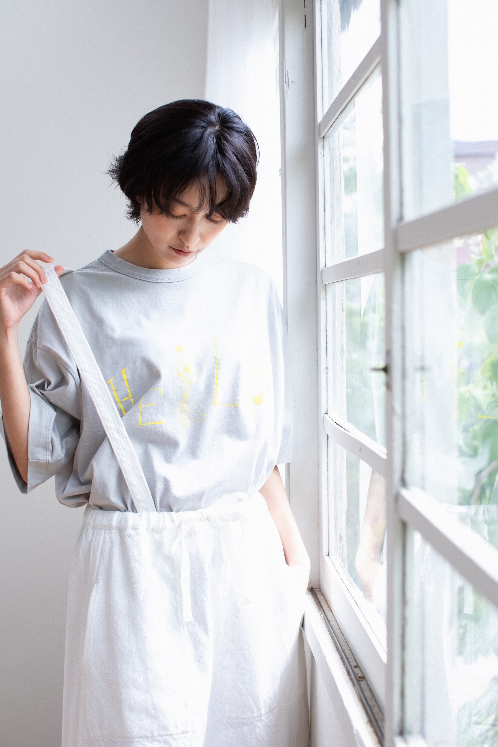 胸に“HELLO”をプリント。Lは花束を持った手のイラスト。